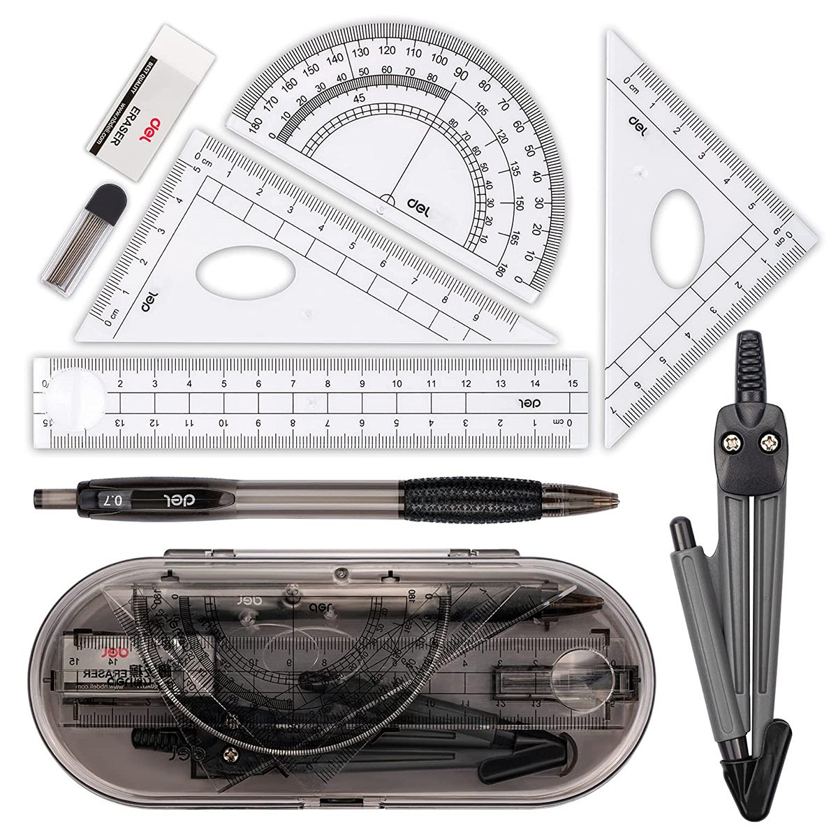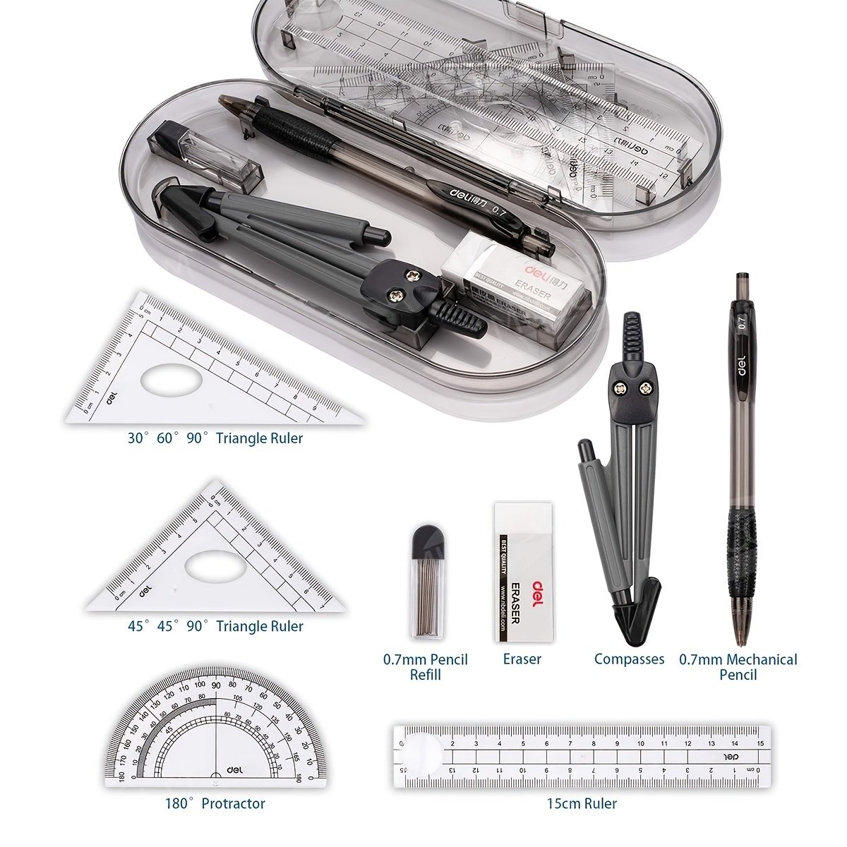 Home > 8pcs Deli Compass Ruler Set With Ruler Protractor Compass Eraser 0.7mm Lead Refills Mechanical Pencil Simple Multifunctional Portable Student Drawing