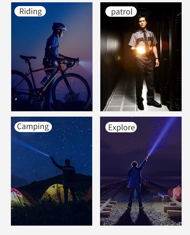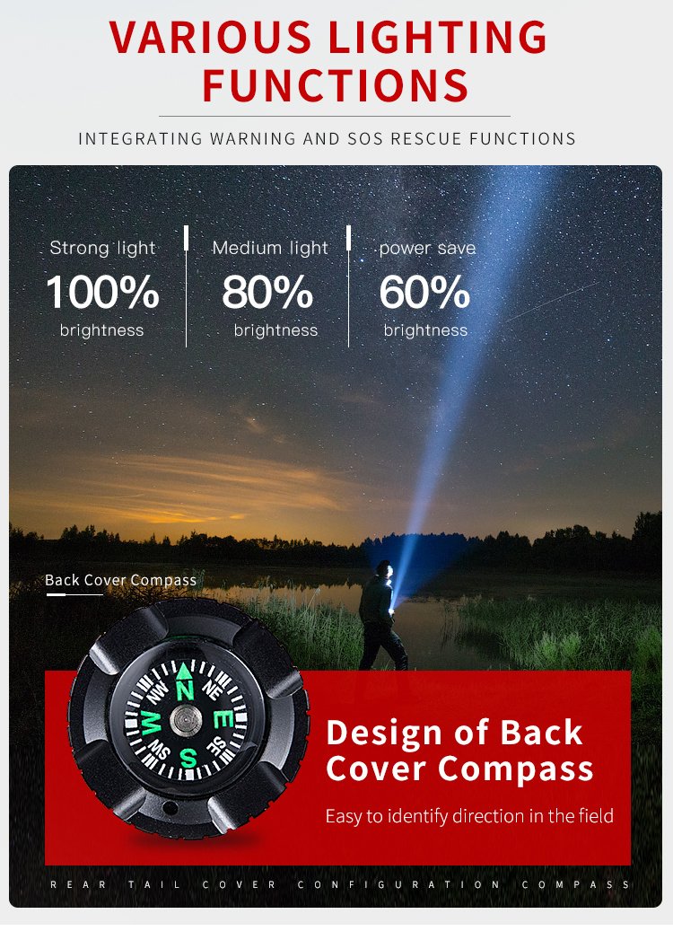 1. Integrating warning and SOS rescue functions ( Strong light 100%; Medium light 80%; power save 50%) 2. The back cover has a compass; so that you do not lose your way at night in field.